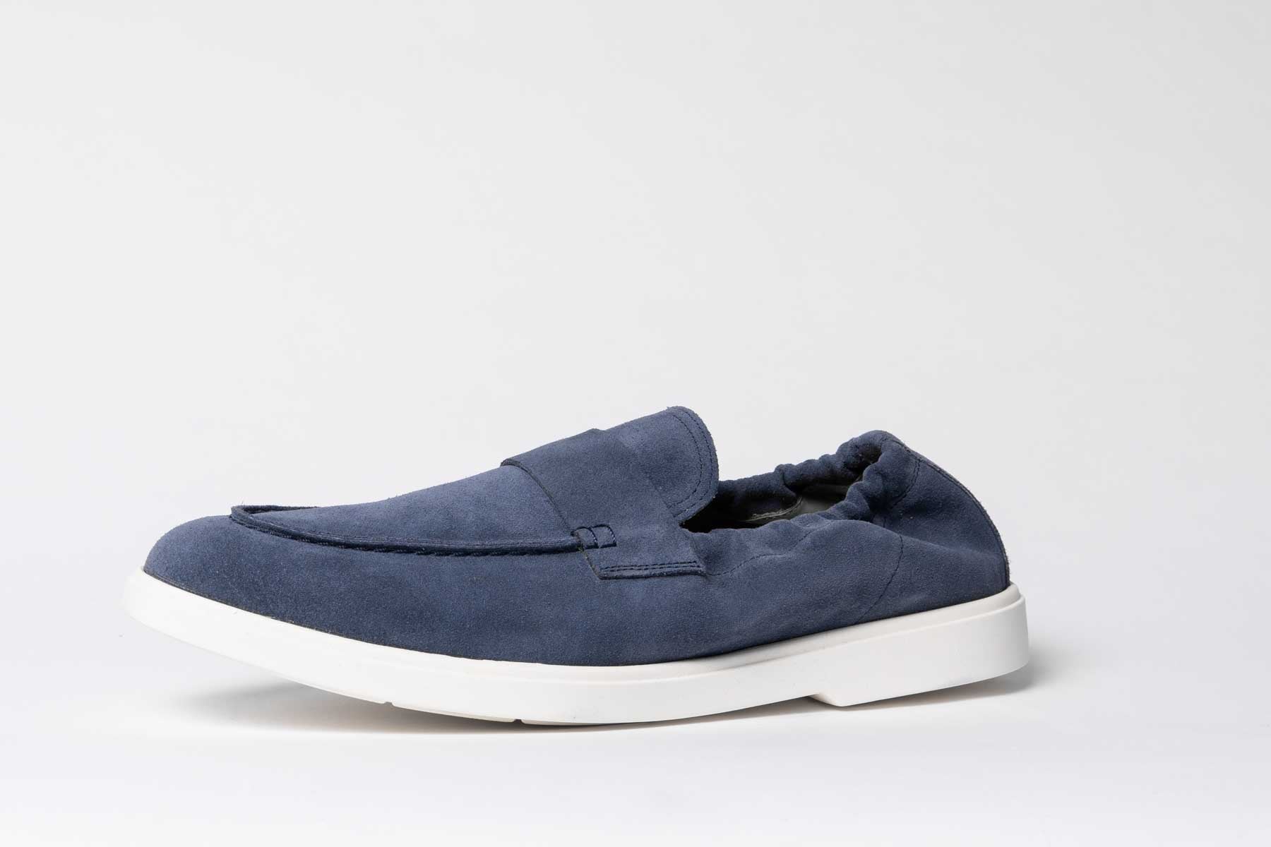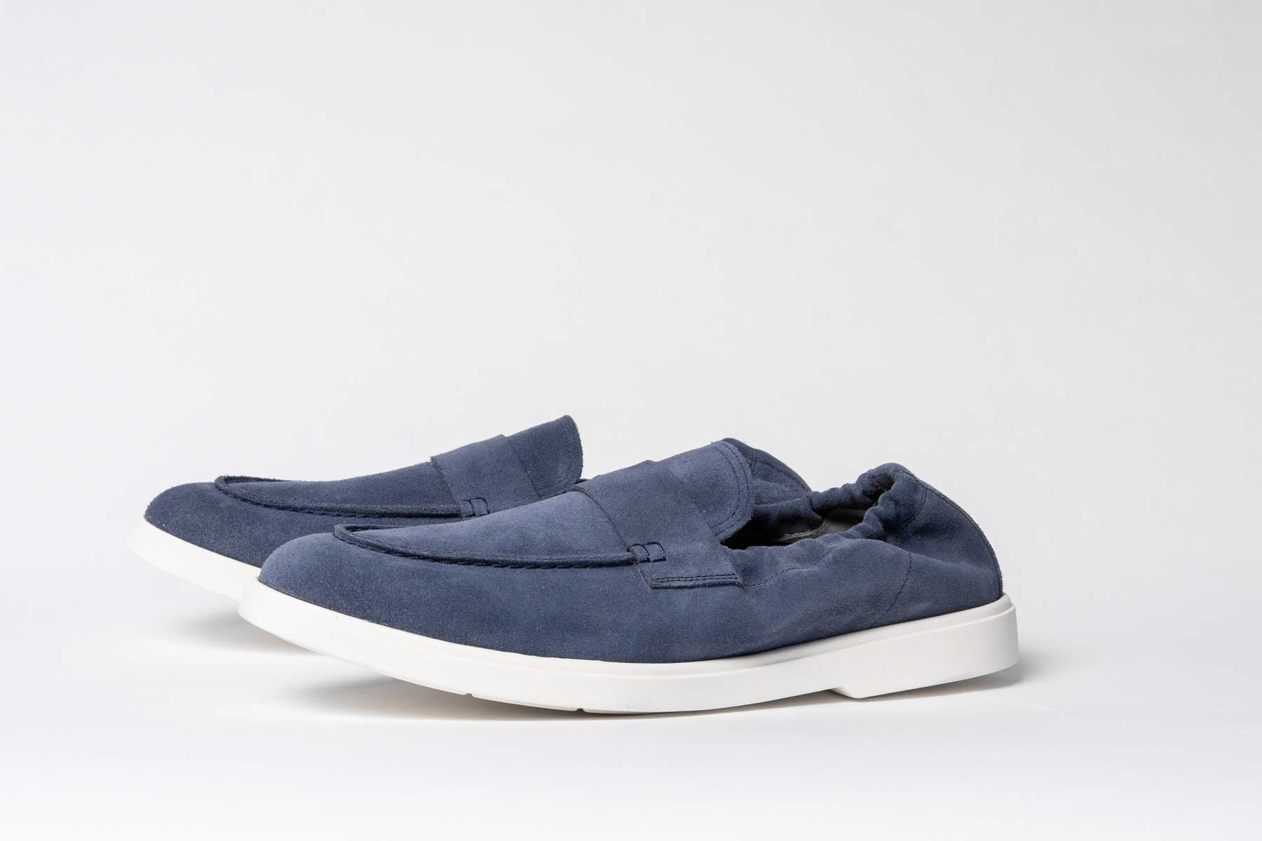A Lightweight proposition for our Spring/Summer Collection. Unlined Loafers for The Noble Shoe by Carlos Santos on an Off-White Sole in Navy Suede.